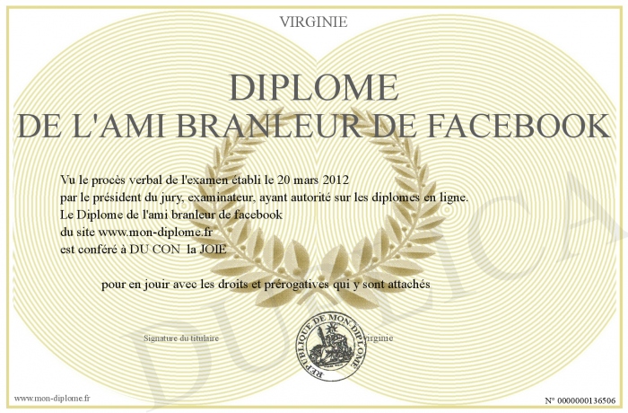 Envoyez par email votre Diplôme de l'ami branleur de facebook personalisé
