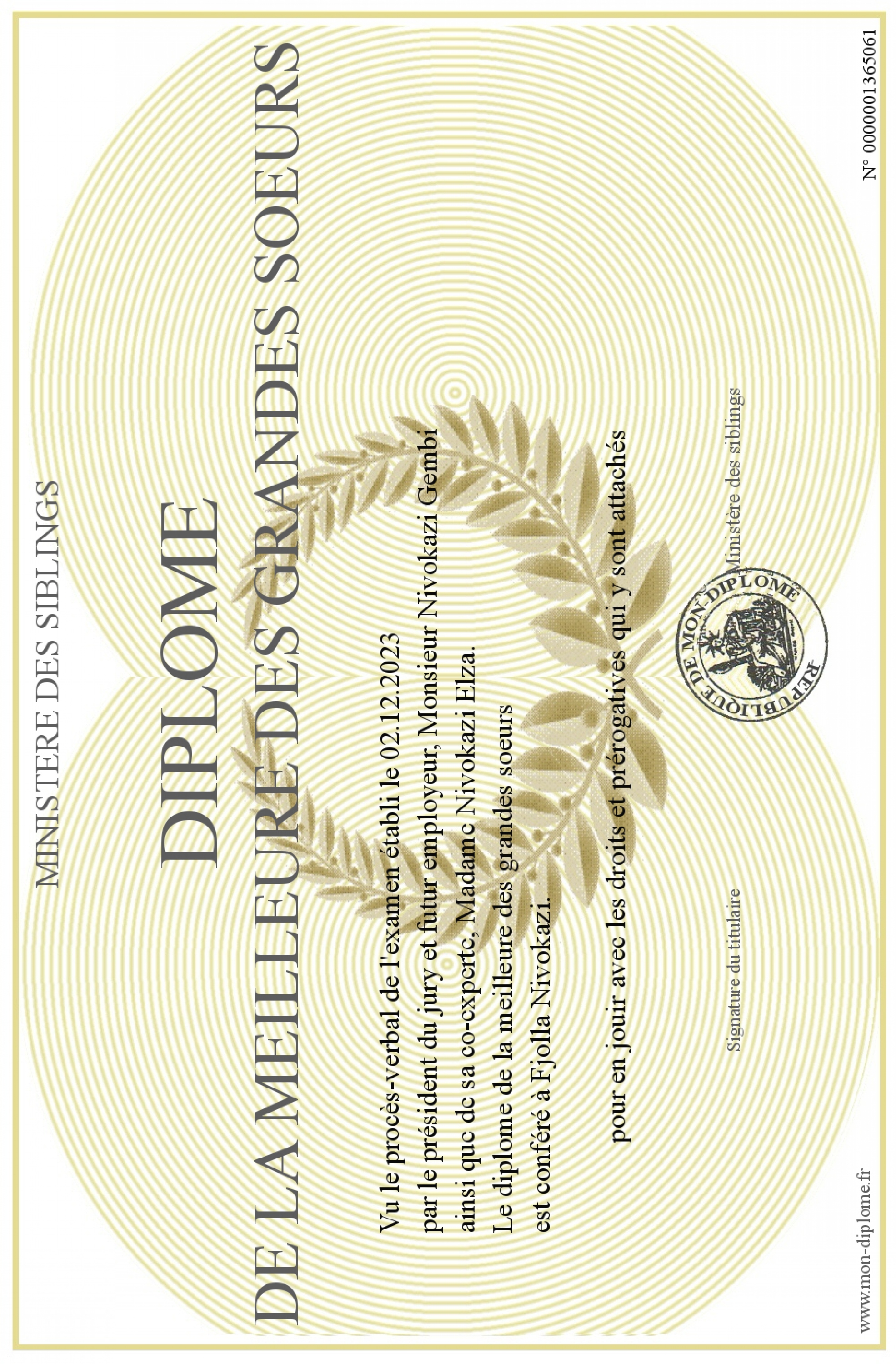 Envoyez par email votre diplôme de la meilleure des grandes soeurs personalisé