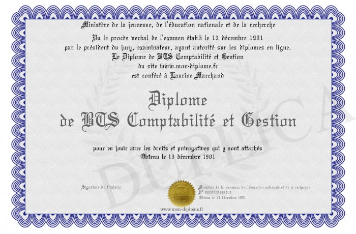 Envoyez par email votre Diplome de BTS Comptabilité et Gestion personalisé