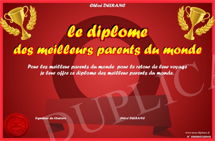 Envoyez par email votre le diplome des meilleurs parents du monde personalisé