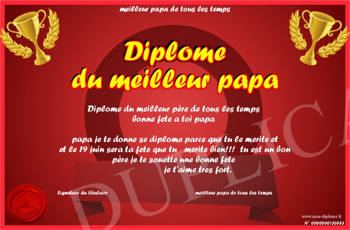 Envoyez par email votre Diplome du meilleur papa personalisé