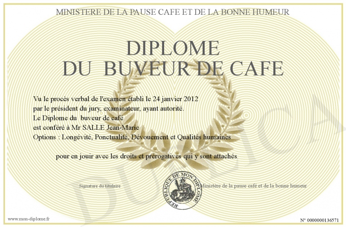 Envoyez par email votre Diplôme du buveur de café personalisé