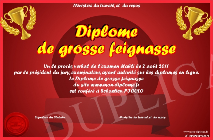 Envoyez par email votre Diplome de grosse feignasse personalisé