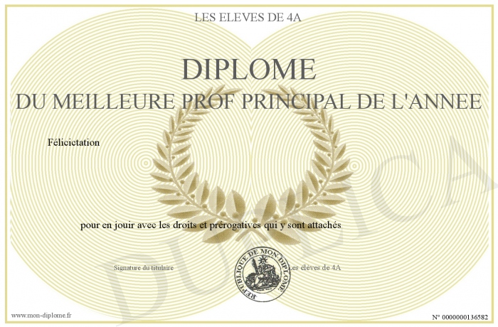 Envoyez par email votre Diplôme du Meilleure prof principal de l'année personalisé