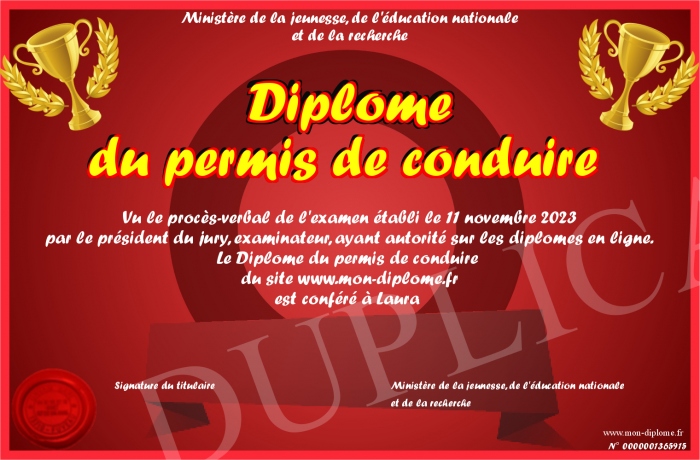 Envoyez par email votre Diplôme du permis de conduire personalisé