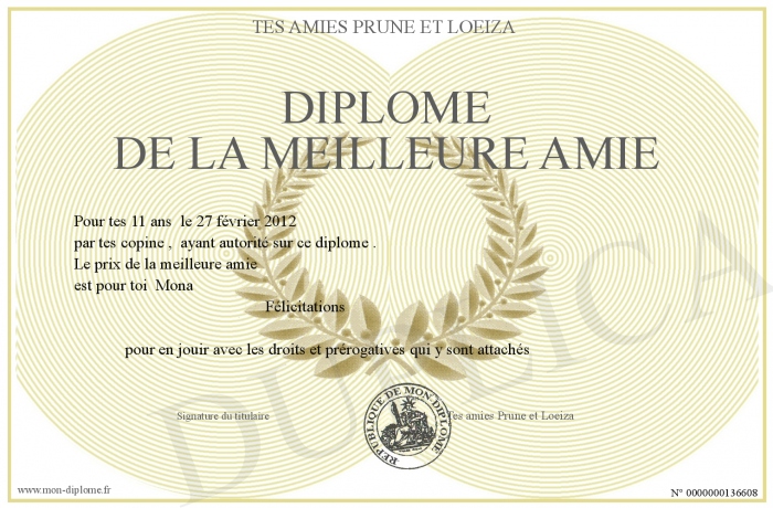 Envoyez par email votre Diplôme de la meilleure amie personalisé