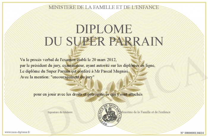 Envoyez par email votre Diplôme du Super Parrain personalisé