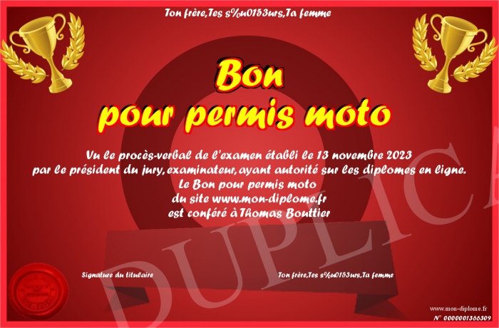 Envoyez par email votre Bon pour permis moto personalisé