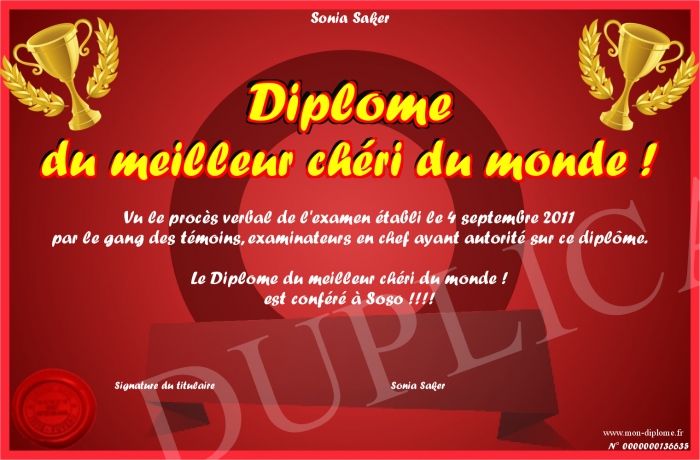 Envoyez par email votre Diplôme du meilleur chéri du monde ! personalisé