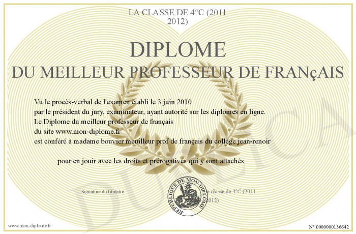 Envoyez par email votre Diplôme du meilleur professeur de français personalisé