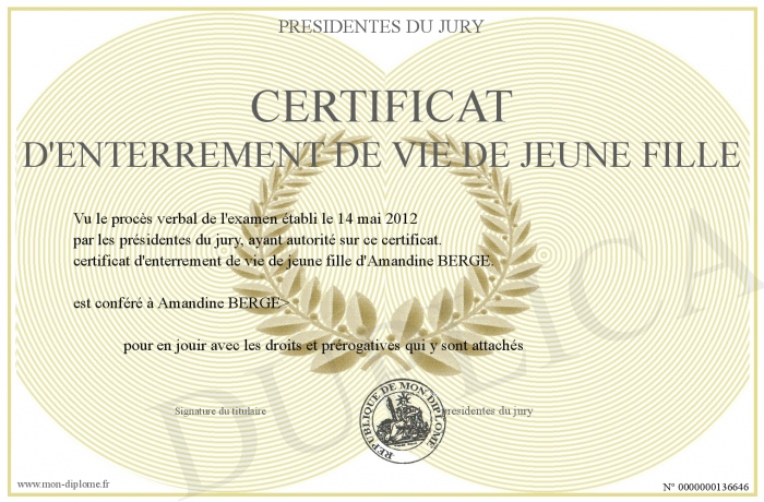 Envoyez par email votre certificat d'enterrement de vie de jeune fille personalisé