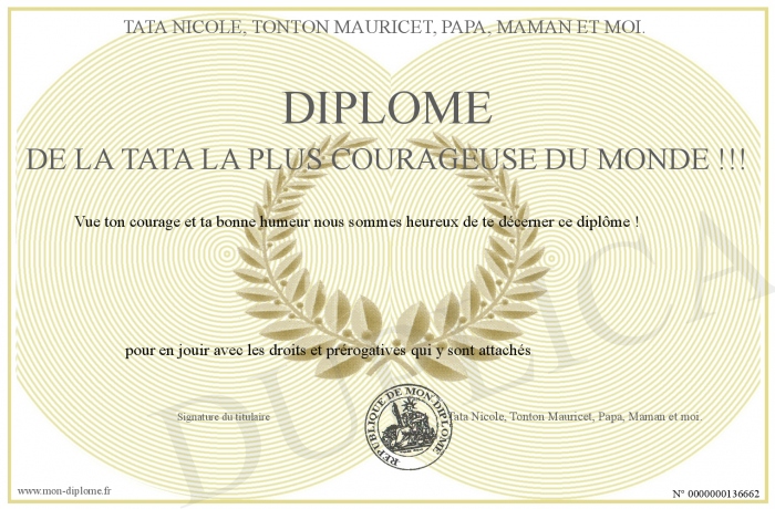 Envoyez par email votre Diplôme de la tata la plus courageuse du monde !!! personalisé