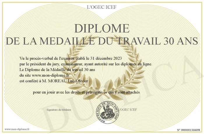 Envoyez par email votre Diplôme de la Médaille du travail 30 ans personalisé