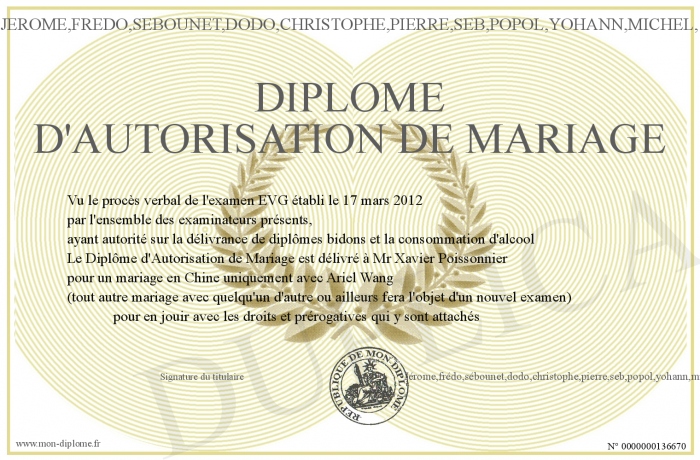 Envoyez par email votre Diplôme D'AUTORISATION DE MARIAGE personalisé