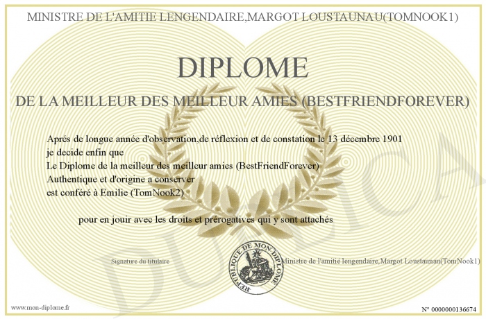 Envoyez par email votre Diplome de la meilleur des meilleur amies (BestFriendForever) personalisé