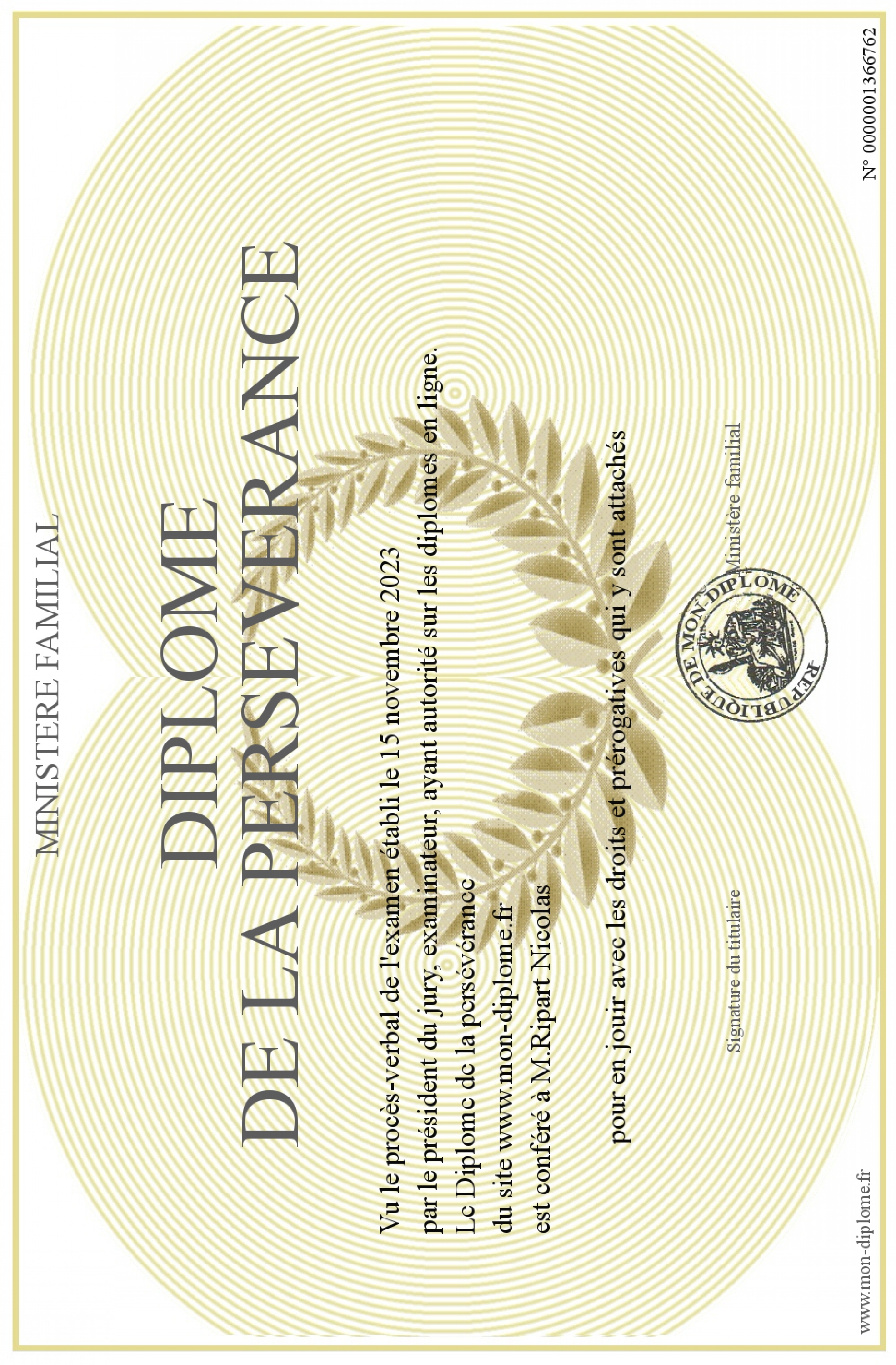 Envoyez par email votre Diplôme de la persévérance personalisé