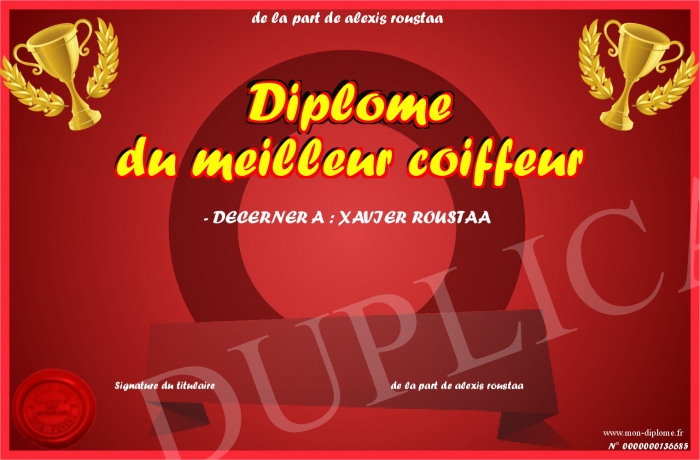 Envoyez par email votre Diplôme du meilleur coiffeur personalisé