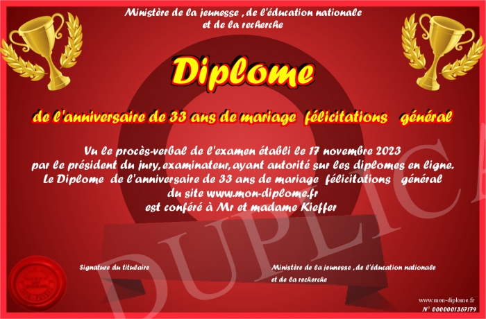 Envoyez par email votre Diplôme de l'anniversaire de 33 ans de mariage félicitations général personalisé
