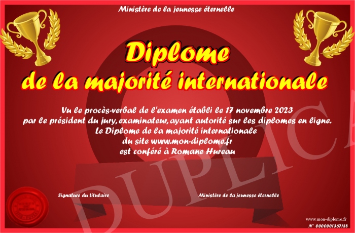 Envoyez par email votre Diplôme de la majorité internationale personalisé