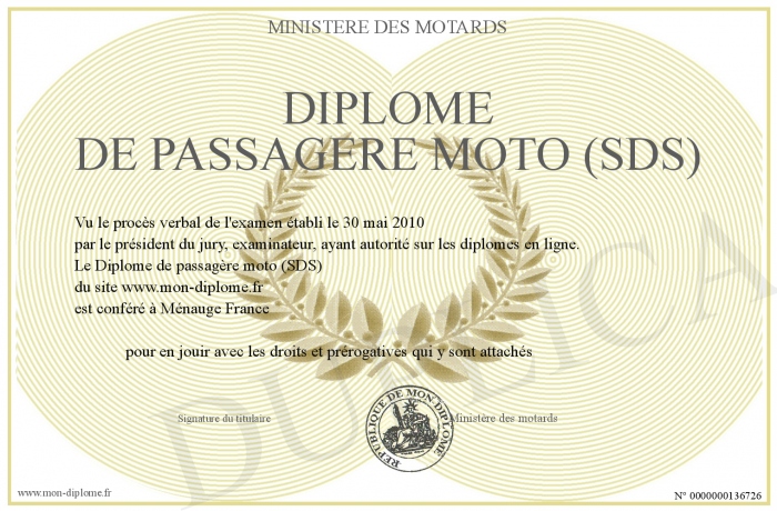 Envoyez par email votre Diplôme de passagère moto (SDS) personalisé