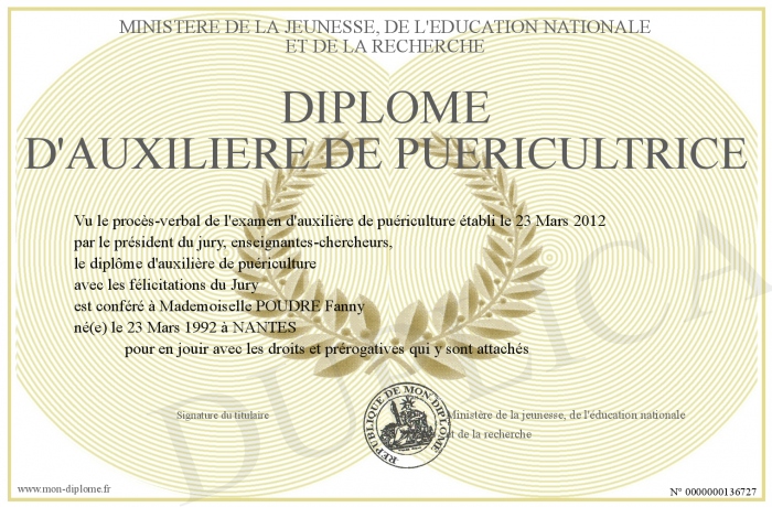 Envoyez par email votre diplôme d'auxilière de puéricultrice personalisé