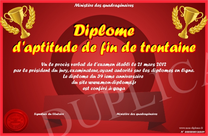 Envoyez par email votre Diplôme d'aptitude de fin de trentaine personalisé