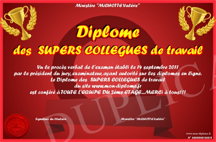 Envoyez par email votre Diplôme des SUPERS COLLEGUES de travail personalisé