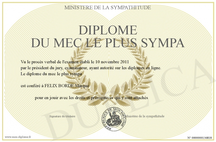Envoyez par email votre diplome du mec le plus sympa personalisé