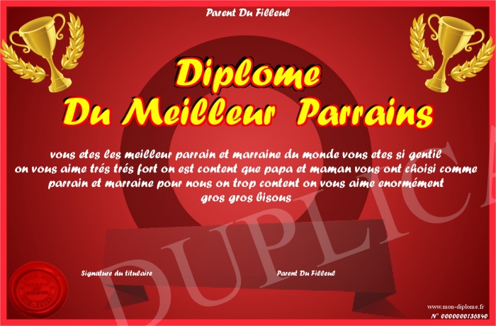 Envoyez par email votre Diplôme Du Meilleur Parrains personalisé