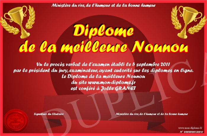 Envoyez par email votre Diplome de la meilleure Nounou personalisé