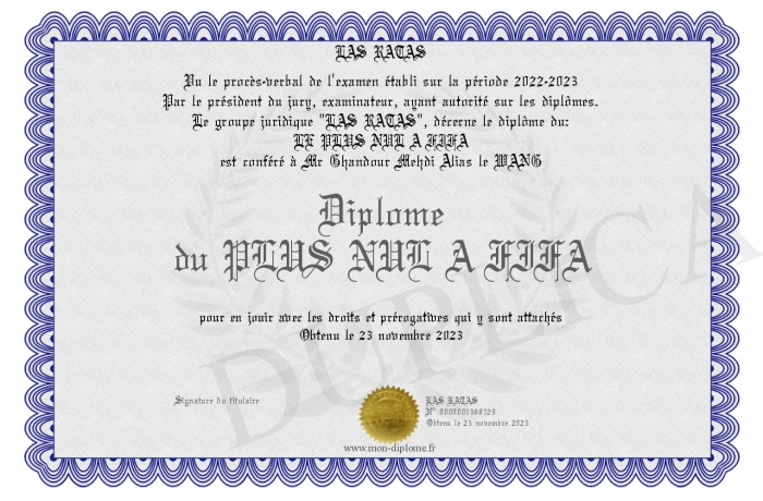 Envoyez par email votre Diplôme du PLUS NUL A FIFA personalisé