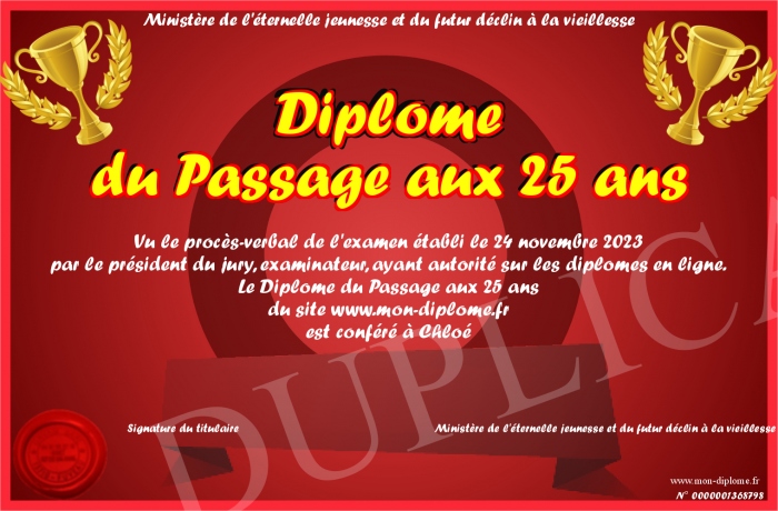 Envoyez par email votre Diplôme du Passage aux 25 ans personalisé
