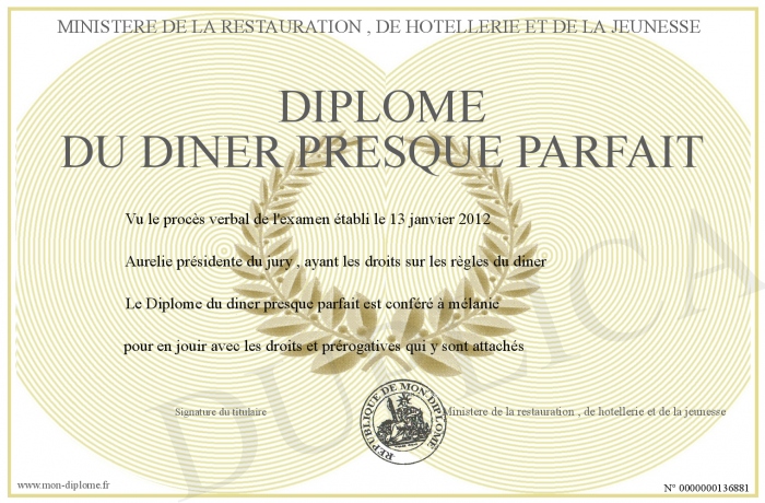 Envoyez par email votre Diplome du diner presque parfait personalisé