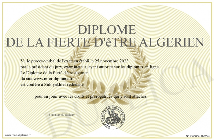 Envoyez par email votre Diplome de la fierté d'être algérien personalisé