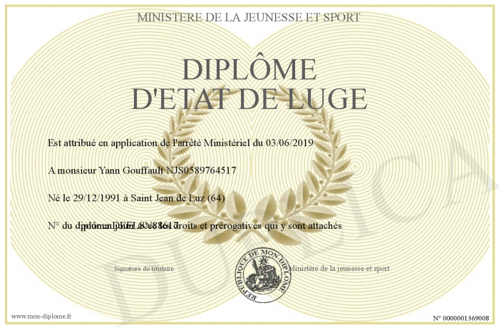 Envoyez par email votre DIPLÔME D'ETAT de LUGE personalisé