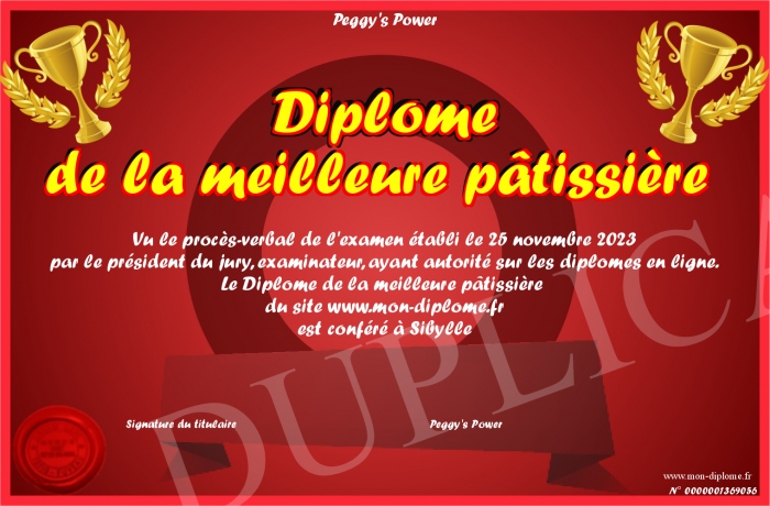 Envoyez par email votre Diplôme de la meilleure pâtissière personalisé