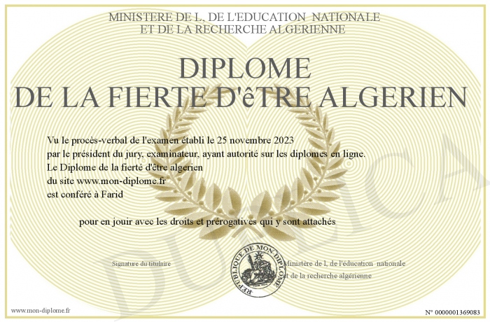 Envoyez par email votre Diplôme de la fierté d'être algerien personalisé