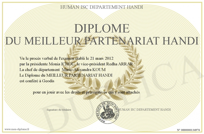 Envoyez par email votre Diplôme du MEILLEUR PARTENARIAT HANDI personalisé