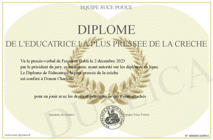 Envoyez par email votre Diplôme de l'éducatrice la plus pressée de la crèche personalisé