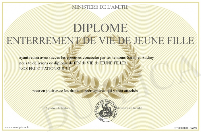 Envoyez par email votre Diplôme ENTERREMENT DE VIE DE JEUNE FILLE personalisé
