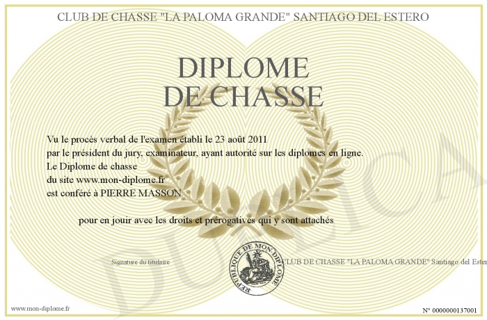 Envoyez par email votre Diplome de chasse personalisé