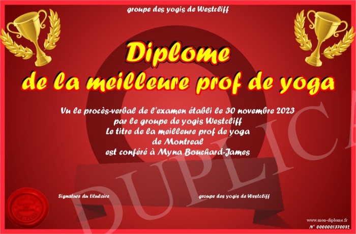 Envoyez par email votre Diplôme de la meilleure prof de yoga personalisé