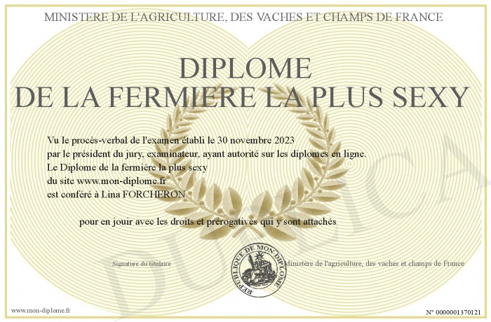 Envoyez par email votre Diplôme de la fermière la plus sexy personalisé