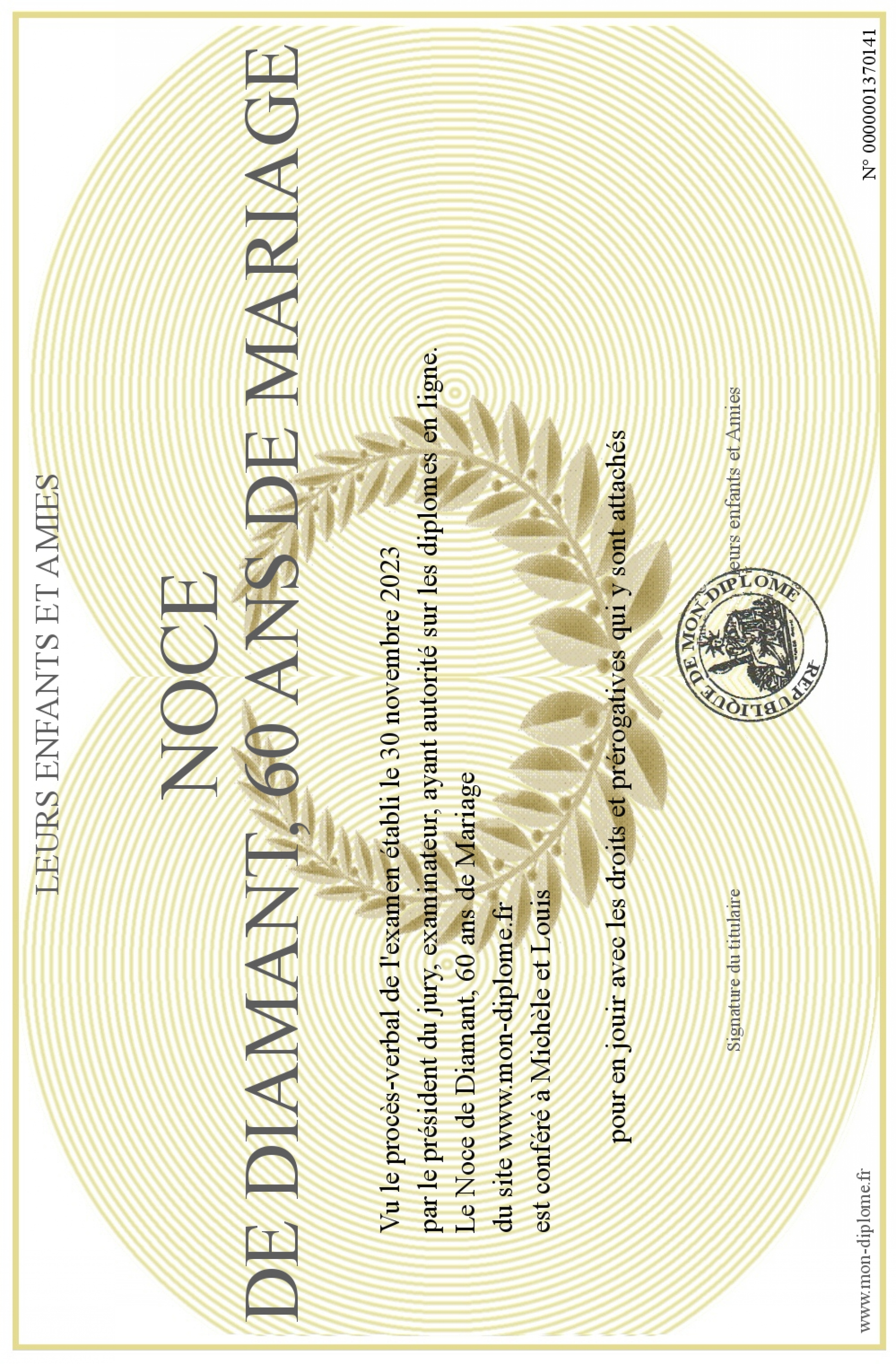Envoyez par email votre Noce de Diamant, 60 ans de Mariage personalisé