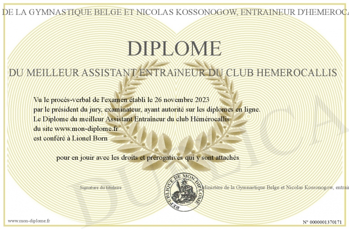 Envoyez par email votre Diplôme du meilleur Assistant Entraîneur du club Hémérocallis personalisé