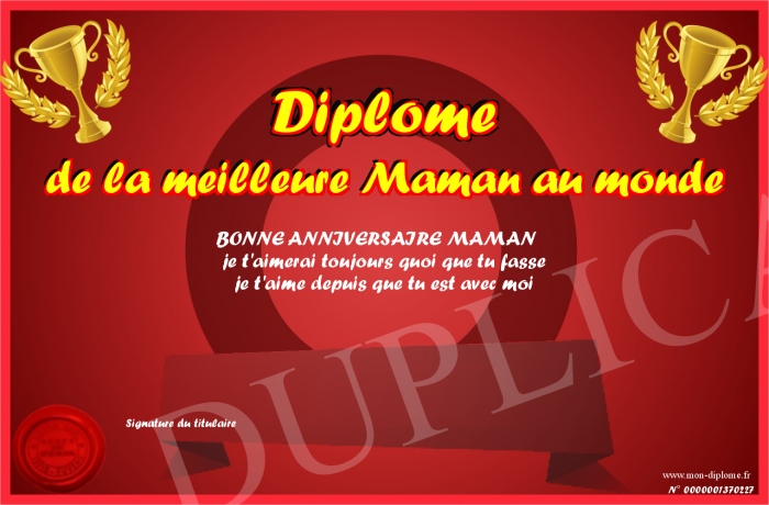 Envoyez par email votre Diplome de la meilleure Maman au monde personalisé