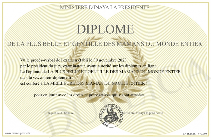 Envoyez par email votre Diplôme de LA PLUS BELLE ET GENTILLE DES MAMANS DU MONDE ENTIER personalisé