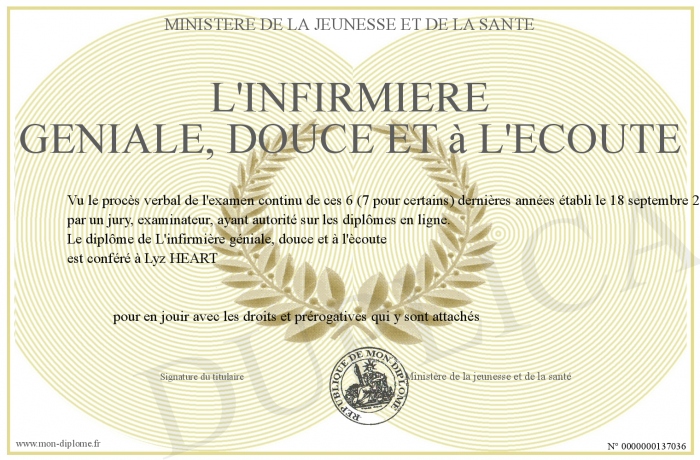 Envoyez par email votre L'infirmière géniale, douce et à l'ècoute personalisé