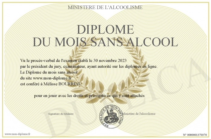 Envoyez par email votre Diplôme du mois sans alcool personalisé