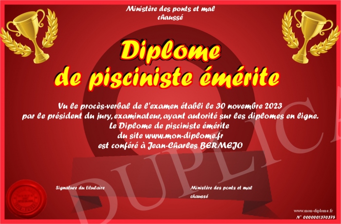 Envoyez par email votre Diplôme de pisciniste émérite personalisé